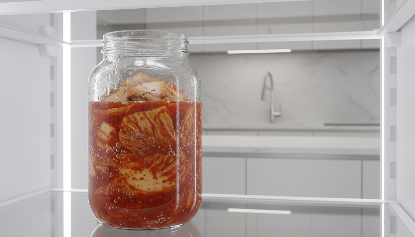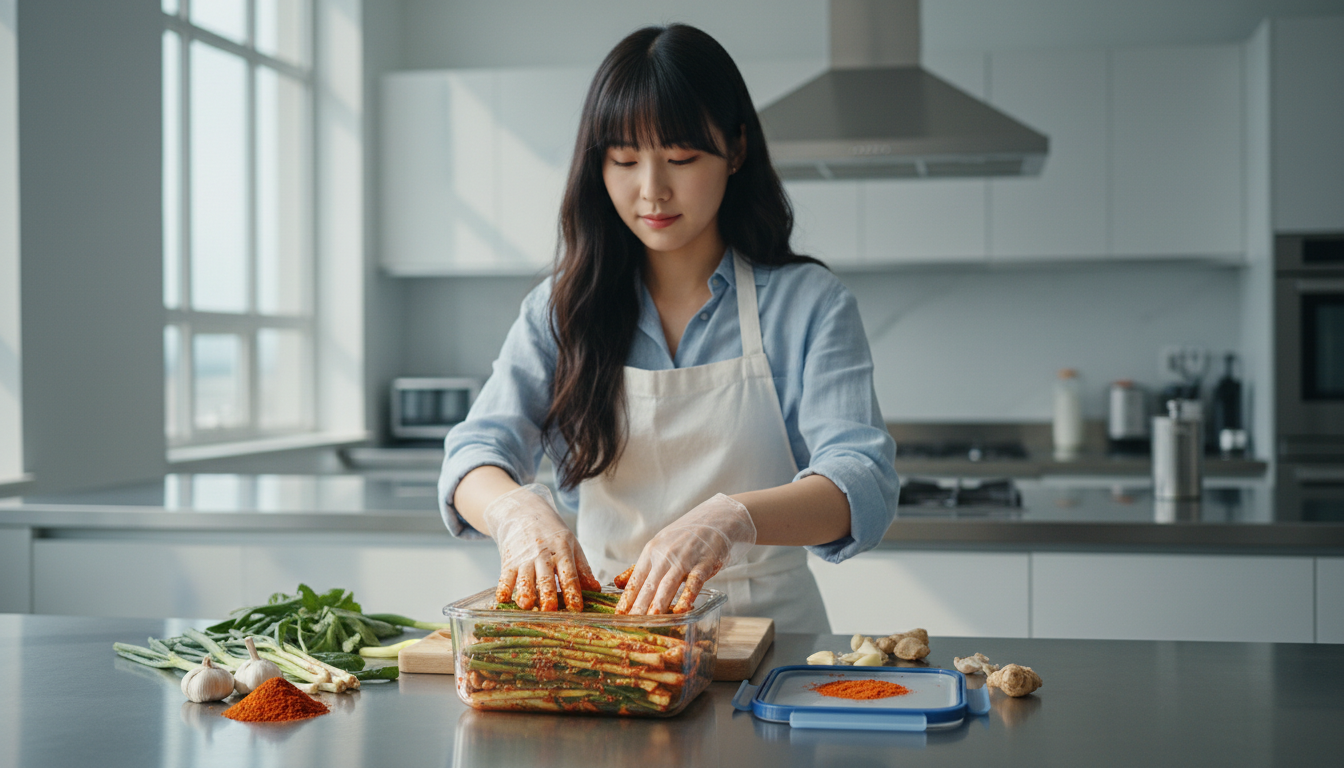 밀폐 용기에 차곡차곡 지그재그로 담고 꾹꾹 눌러 공기를 빼준 뒤, 직사광선이 없는 서늘한 실온에서 하루(여름에는 반나절) 정도 숙성시켜 주세요. 뚜껑을 열었을 때 가장자리에서 기포가 뽀글뽀글 올라오고 새콤달콤한 익은 냄새가 나면 그때 김치냉장고로 직행하시면 됩니다.