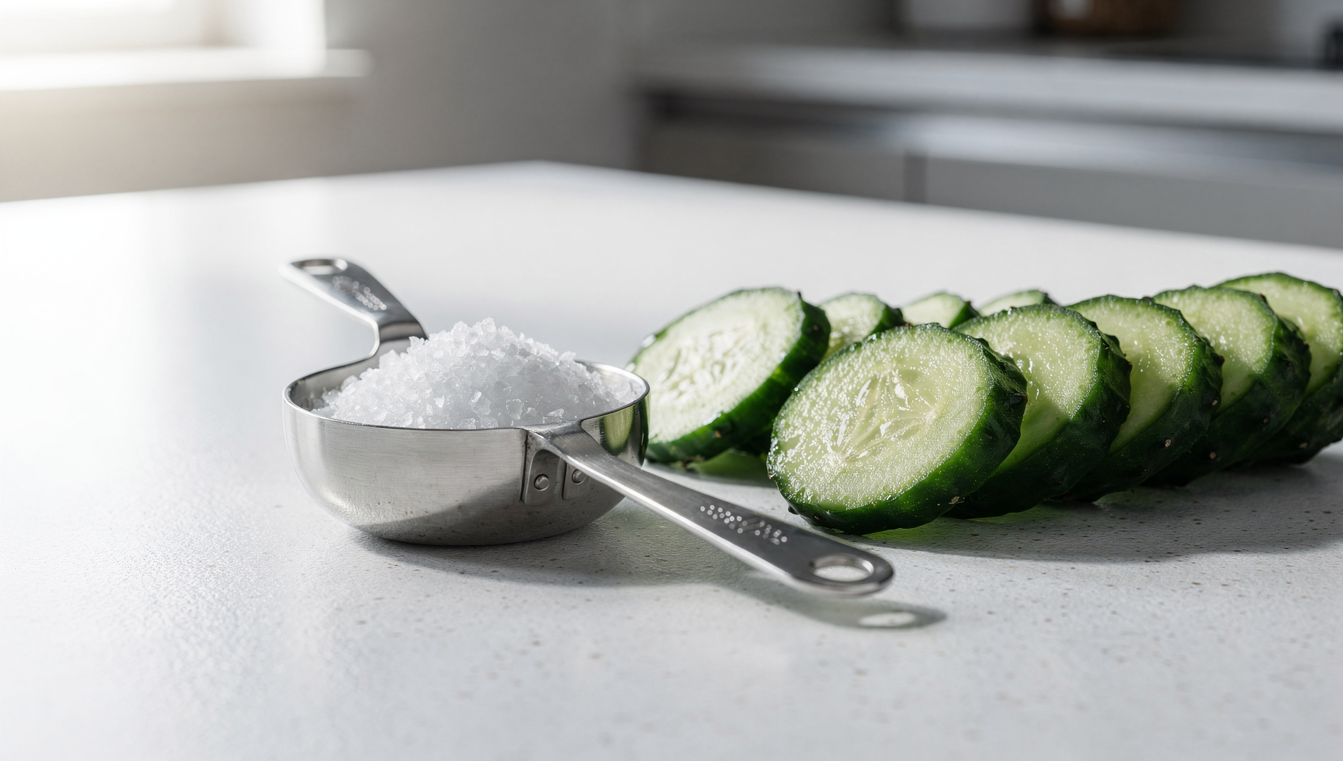 오이는 반달 모양이나 어슷썰기로 0.4~0.5cm 두께로 썰어주세요. 너무 얇으면 절이는 과정에서 금세 흐물거리고, 너무 두꺼우면 간이 잘 배지 않습니다. 썬 오이에 소금을 넉넉히 뿌려 10~15분 정도 절여줍니다. 소금 양은 오이 1개 기준 소금 1작은술(tsp) 정도가 적당합니다.