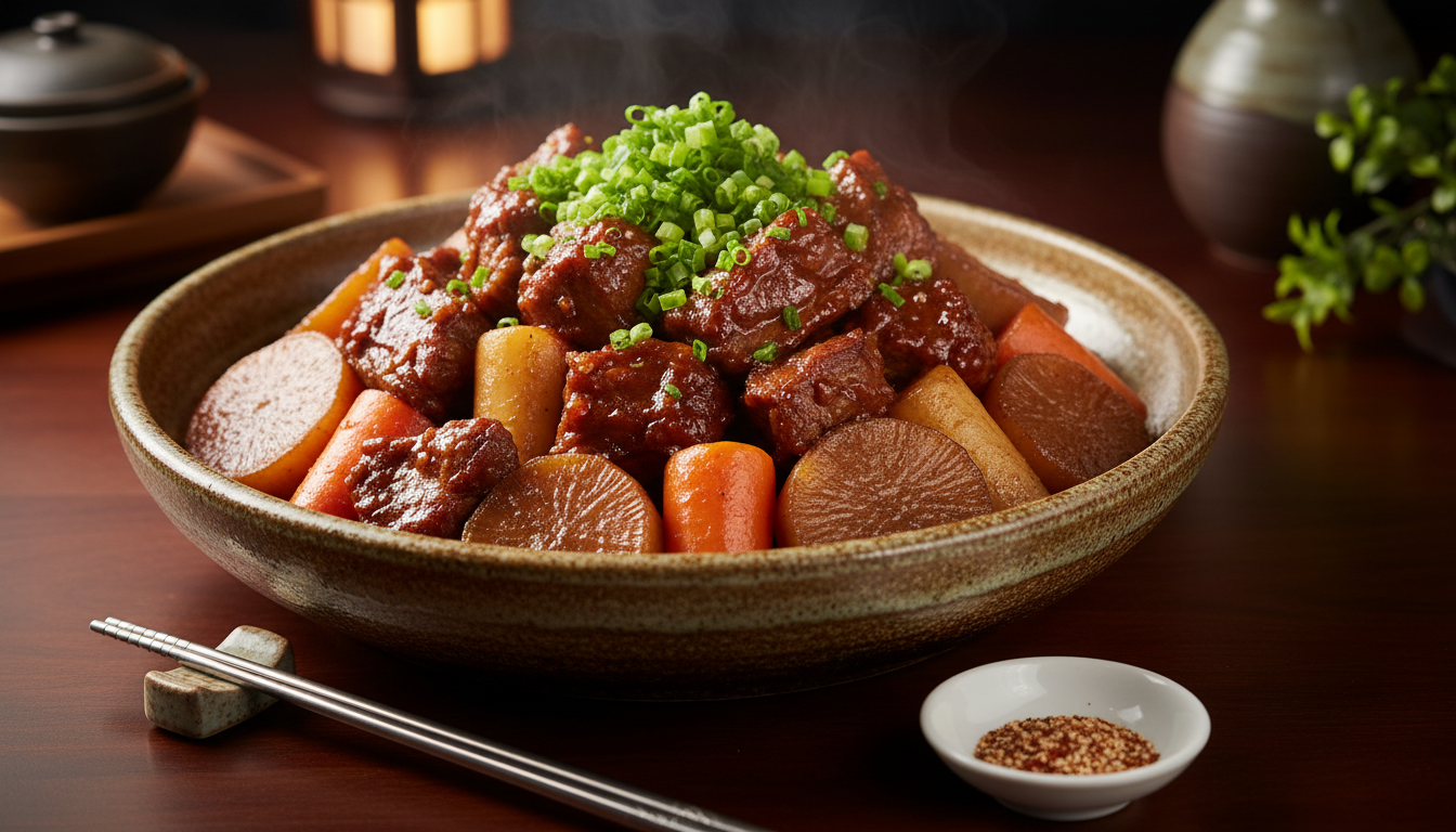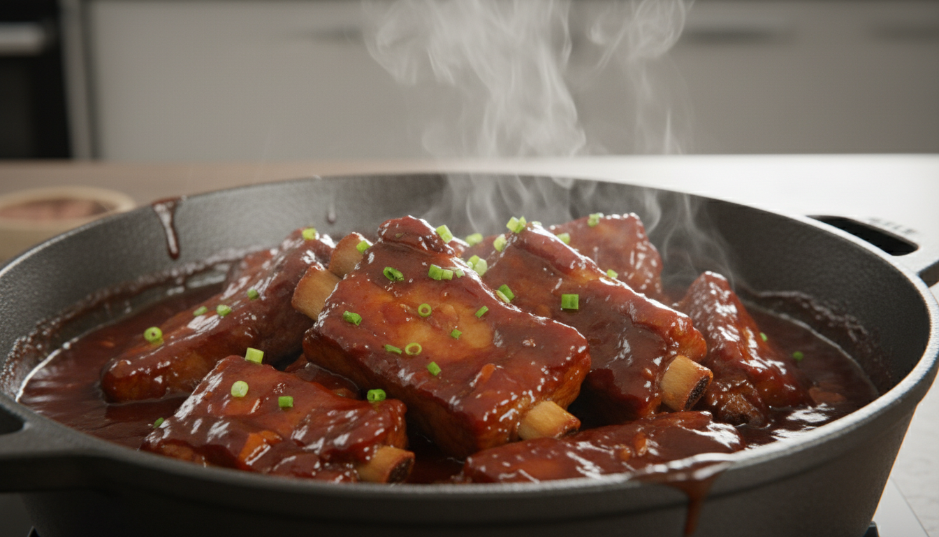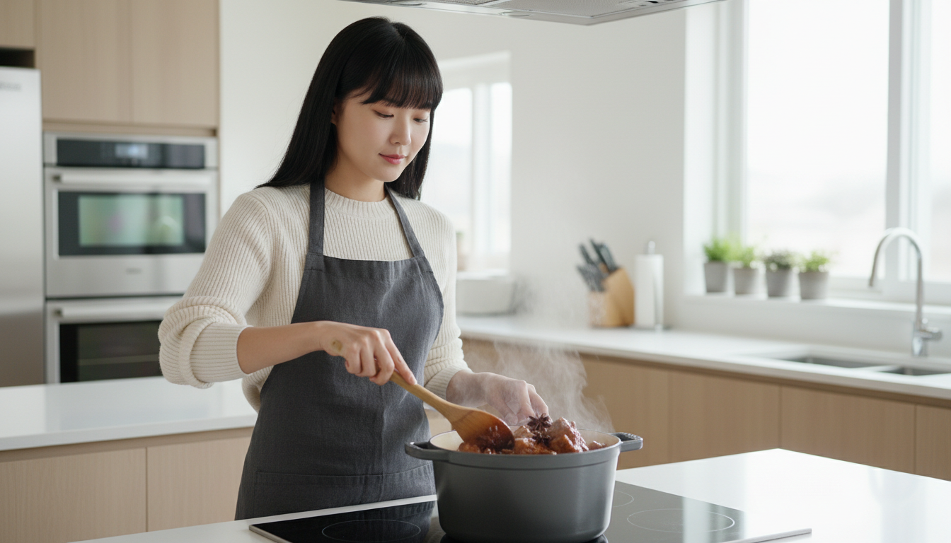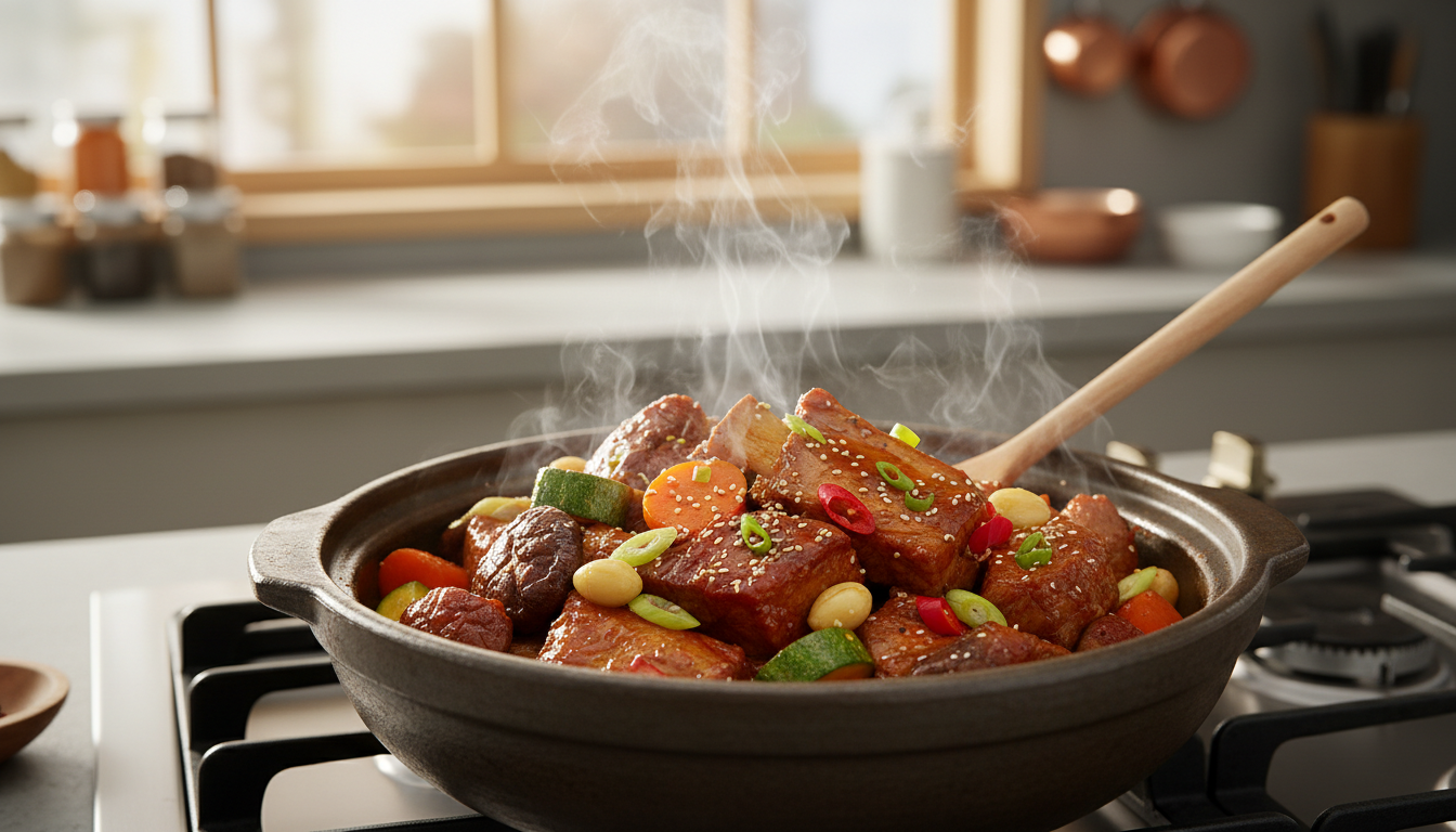 중반 이후에는 뚜껑을 열고 약불로 졸이면서 양념을 끼얹어 주면 윤기 나는 마무리가 완성됩니다. 돼지갈비찜 맛있게 만드는 법의 진짜 비결은 여기서 서두르지 않는 것입니다. 최소 40분 이상 푹 익혀야 고기가 뼈에서 살짝 떨어질 만큼 부드러워져요. 😊