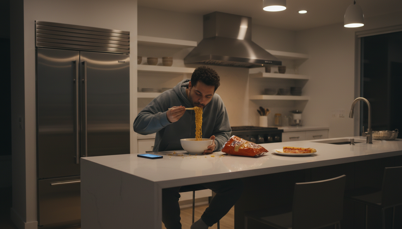 • 전날 야식 또는 고탄수화물 저녁 식사: 늦은 시간에 먹은 빵, 면류, 과자 등은 다음 날 아침 공복혈당을 끌어올립니다.