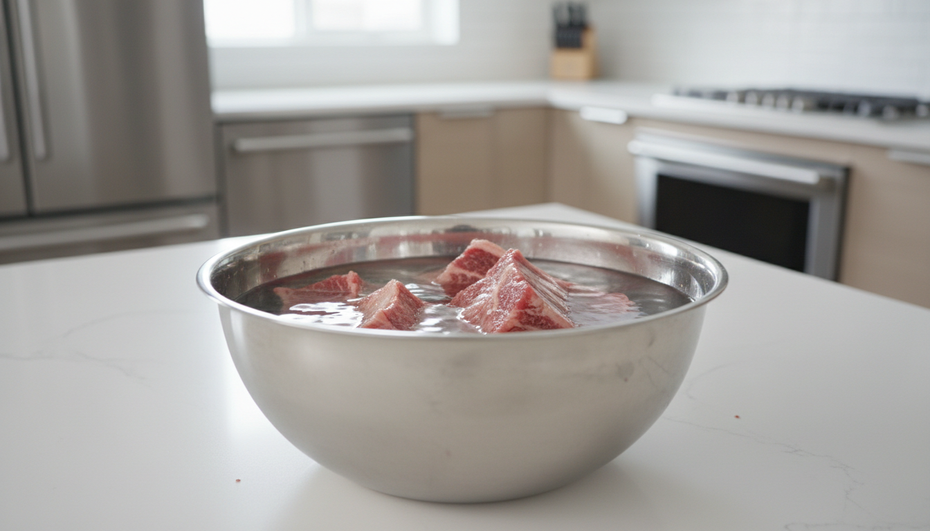 시간이 없을 때는 끓는 물에 갈비를 2~3분 데쳐낸 뒤 찬물에 헹구는 방법을 씁니다. 이 방법은 잡내 제거 효과도 있어 1석2조예요. 단, 너무 오래 데치면 육질이 손상될 수 있으니 주의하세요.